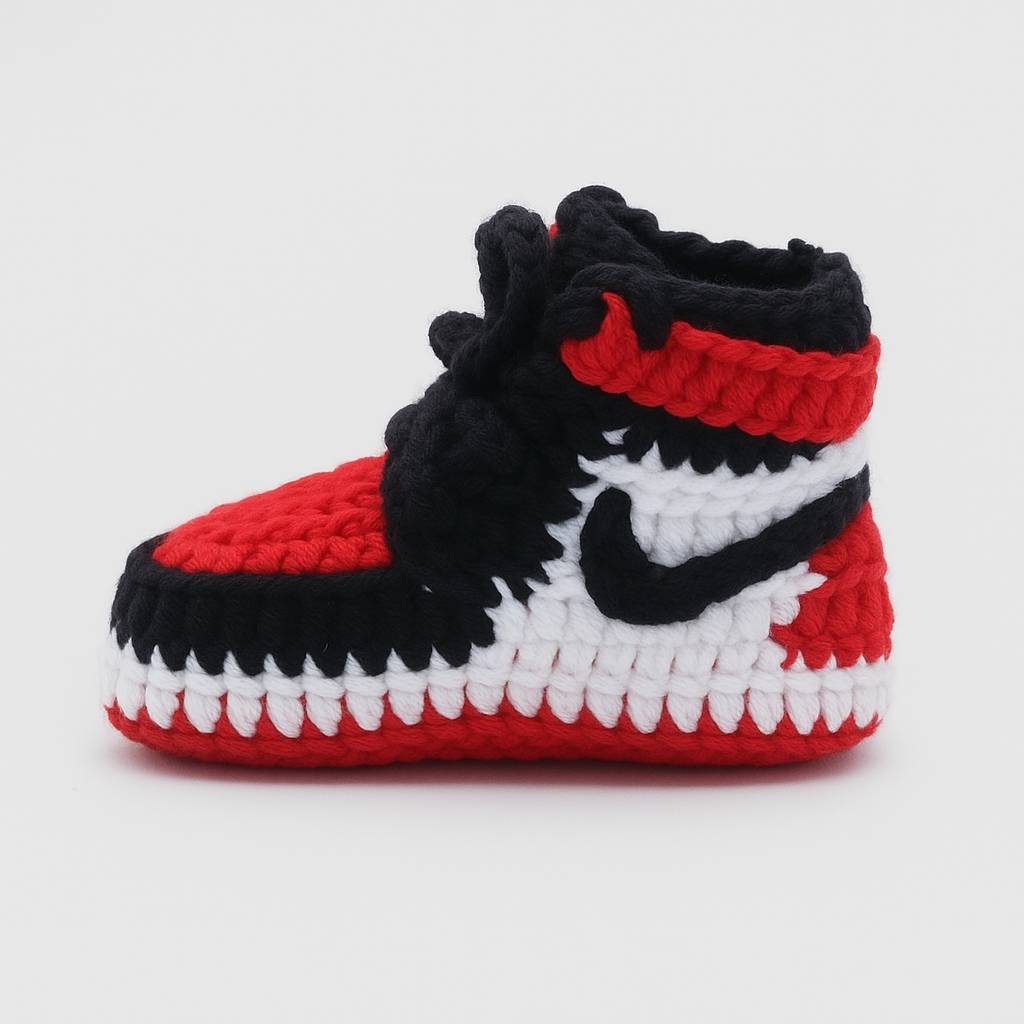 Handmade baby booties inspired by classic sneaker styles. Soft, lightweight, and cozy. Perfect for tiny feet with big drip. Because each Knittie is handmade, slight differences may occur — adding a special, one-of-a-kind touch to every pair.